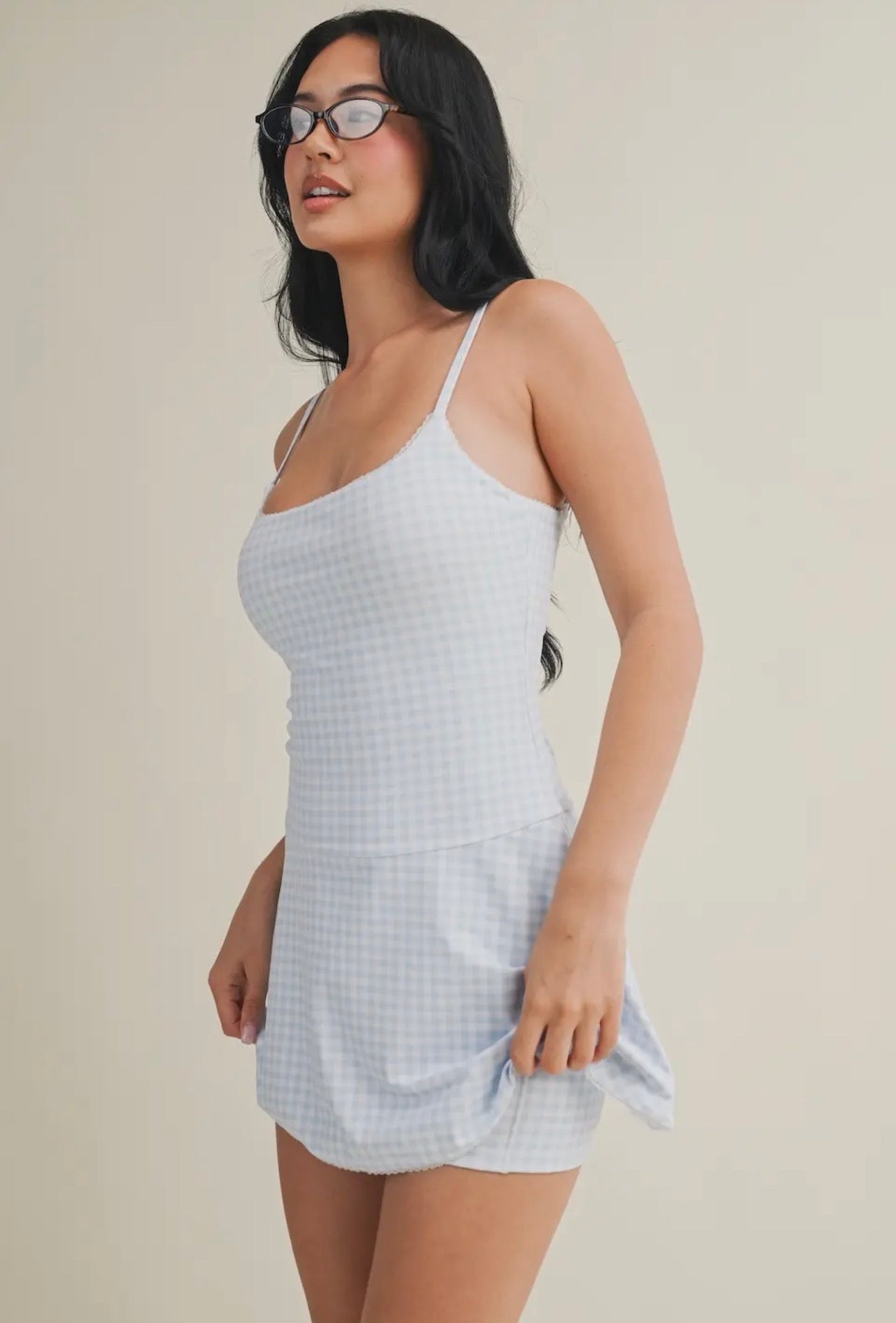 flirty, feminine and effortlessly chic. 82% polyester 28% spandex. all over gingham print with lace trim.