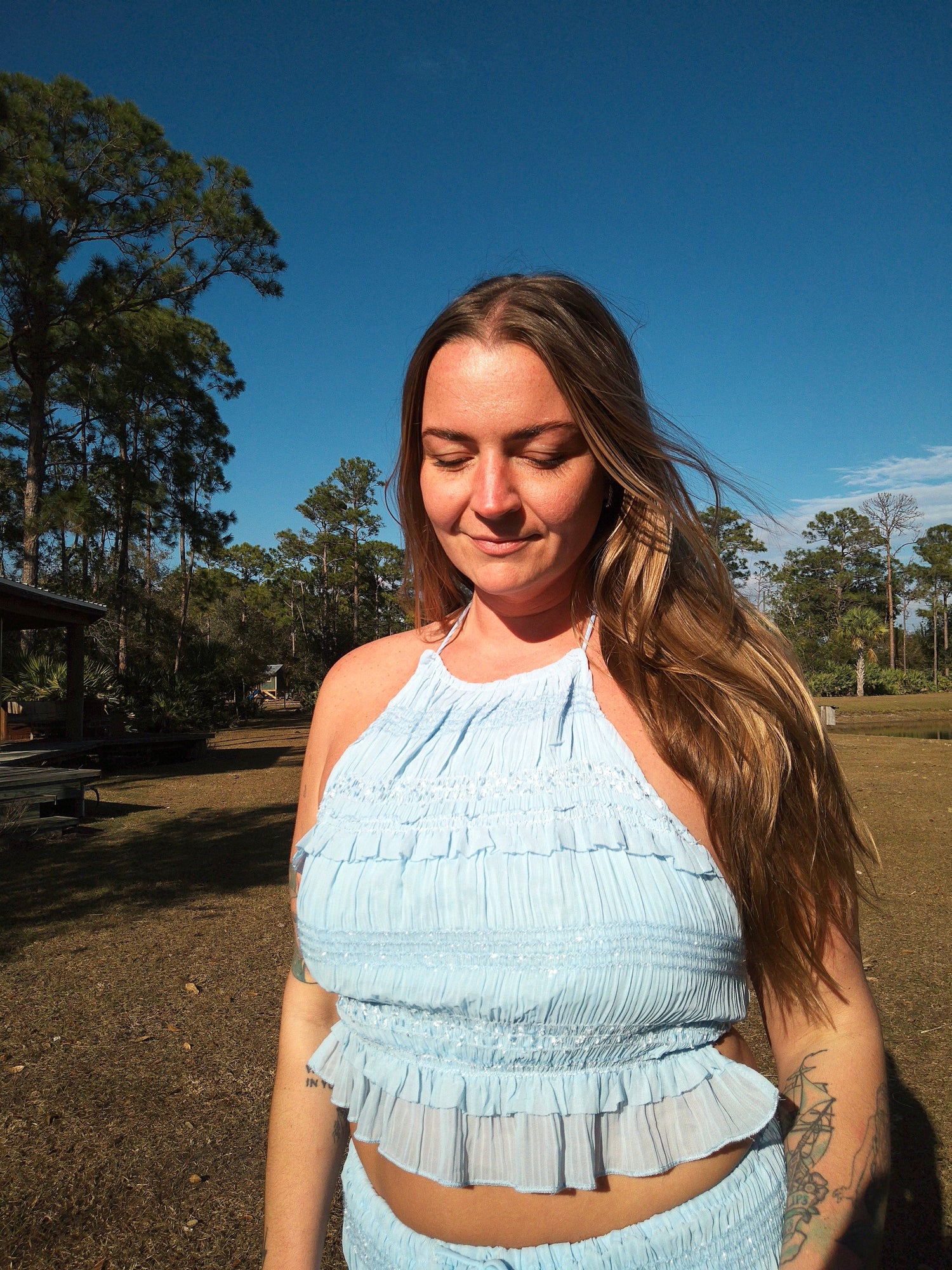 baby blue sparkly halter top and matching maxi skirt. top tis around neck. skirt has elastic waistband.