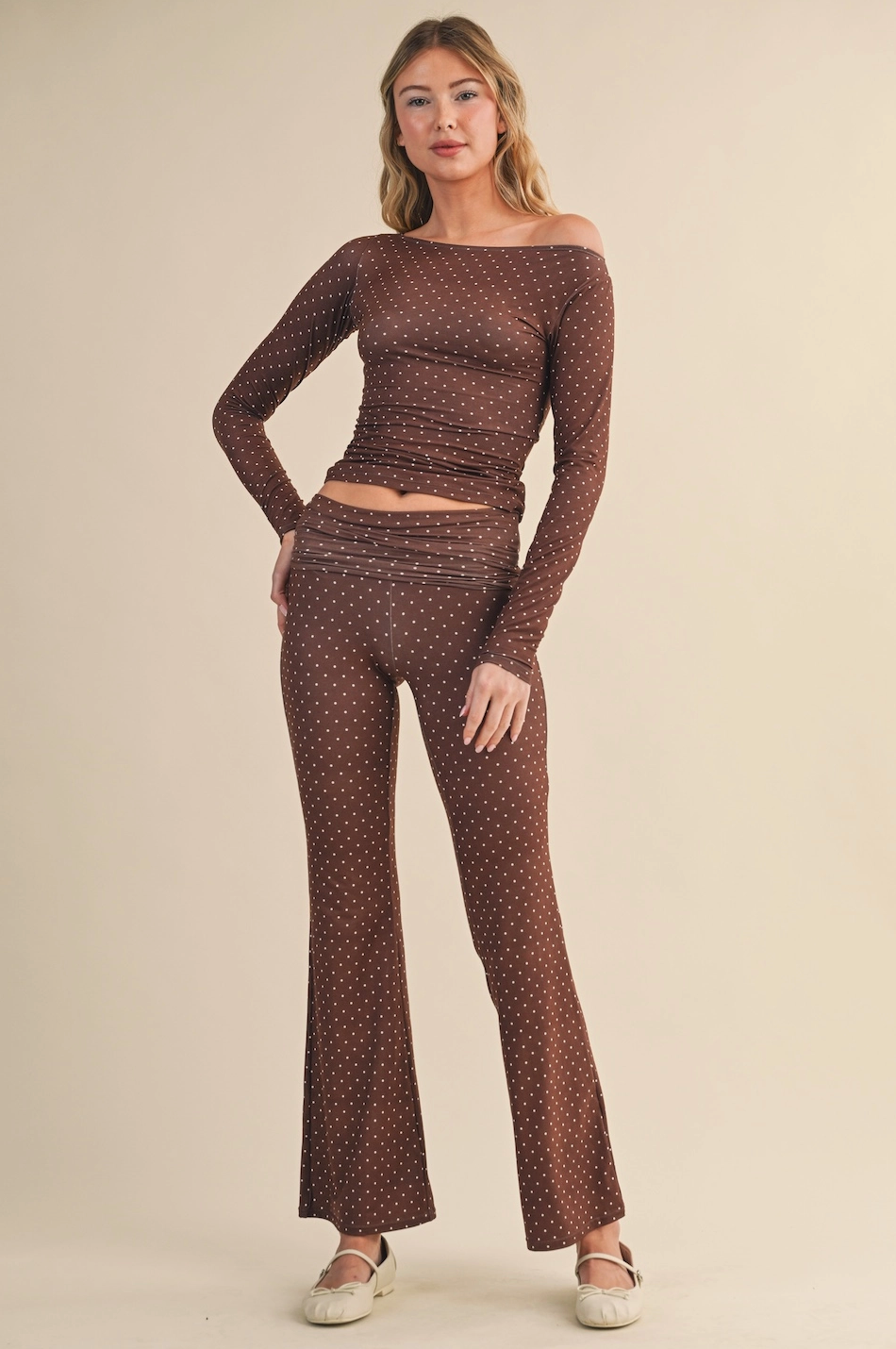 Soft knit jersey off-the-shoulder, form-fitting long-sleeve in a playful polka dot print. 85% POLYESTER 15% SPANDEX