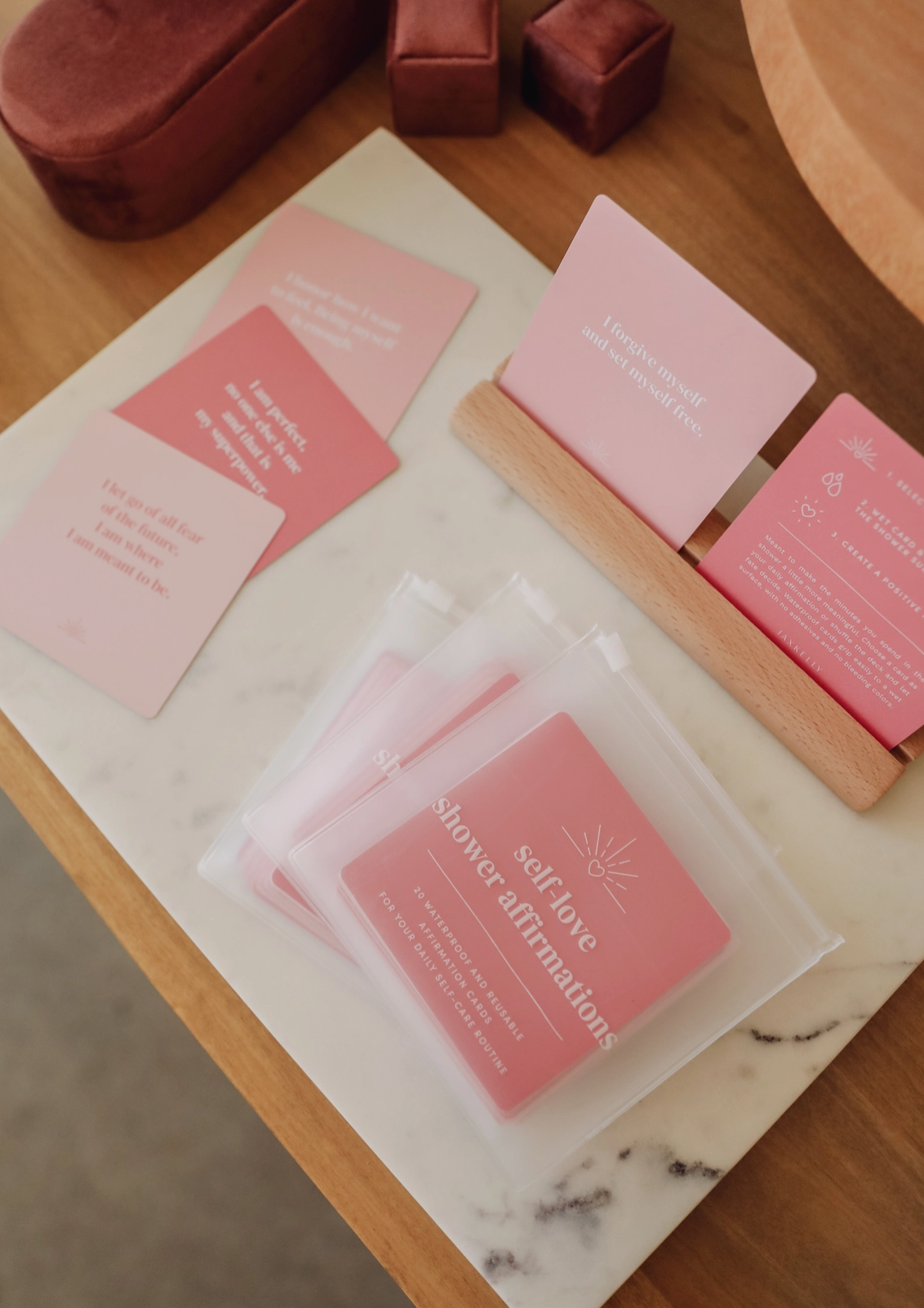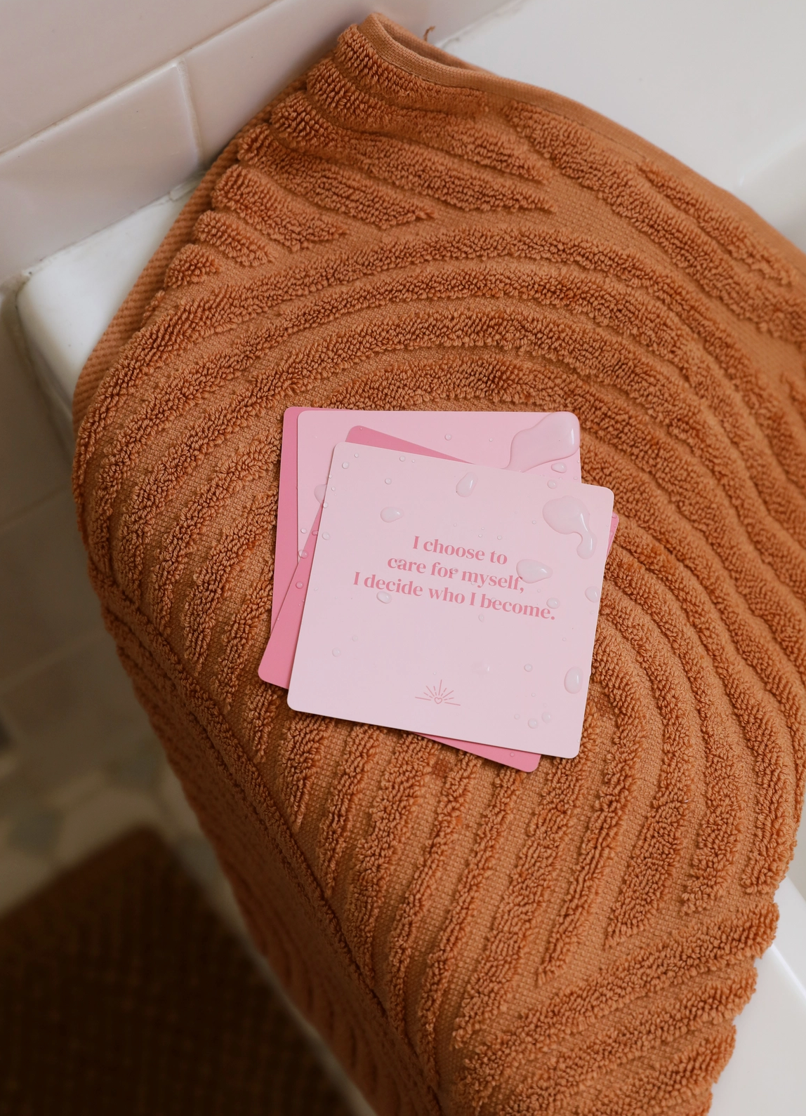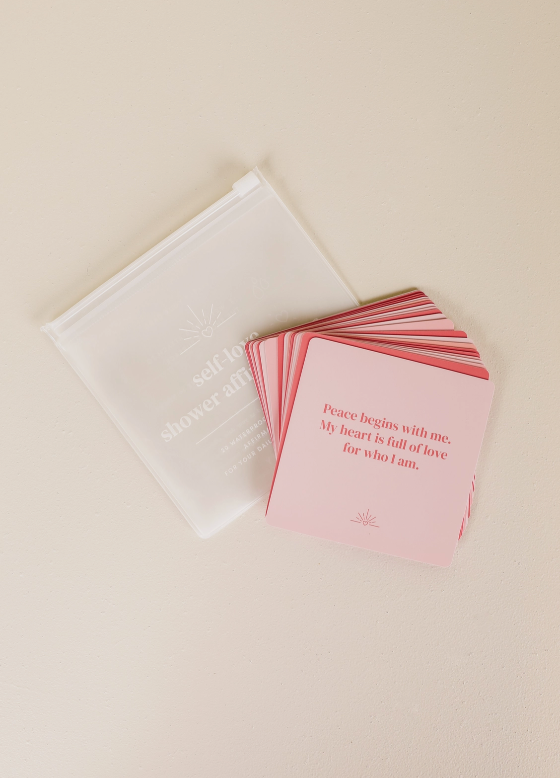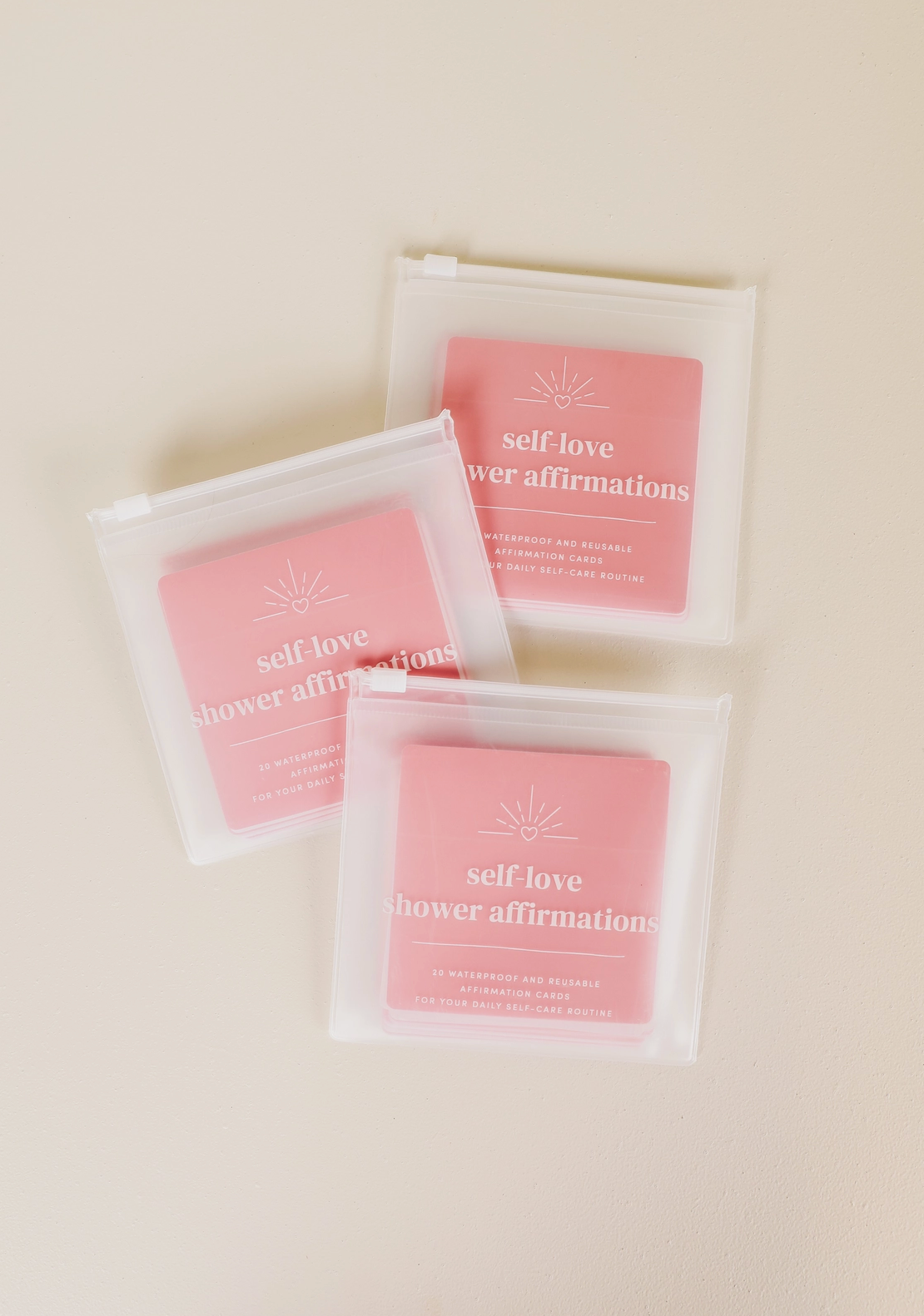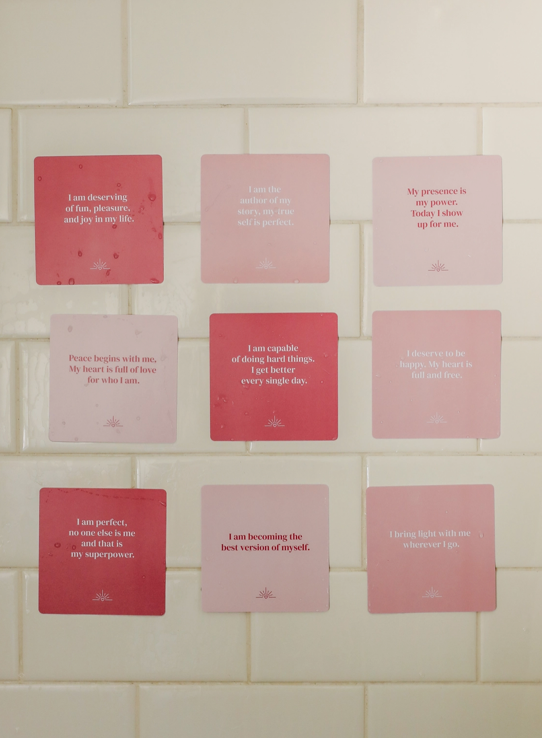 Includes 20 unique quotes surrounding self-love and acceptance. Waterproof and reusable cards that grip easily on a wet surface, with no adhesives and no bleeding colors. These cards, once wet, will temporarily self-grip to the shower wall, mirror, window, or any smooth flat surface. Move the card on your own, or once the water evaporates, the card will release.